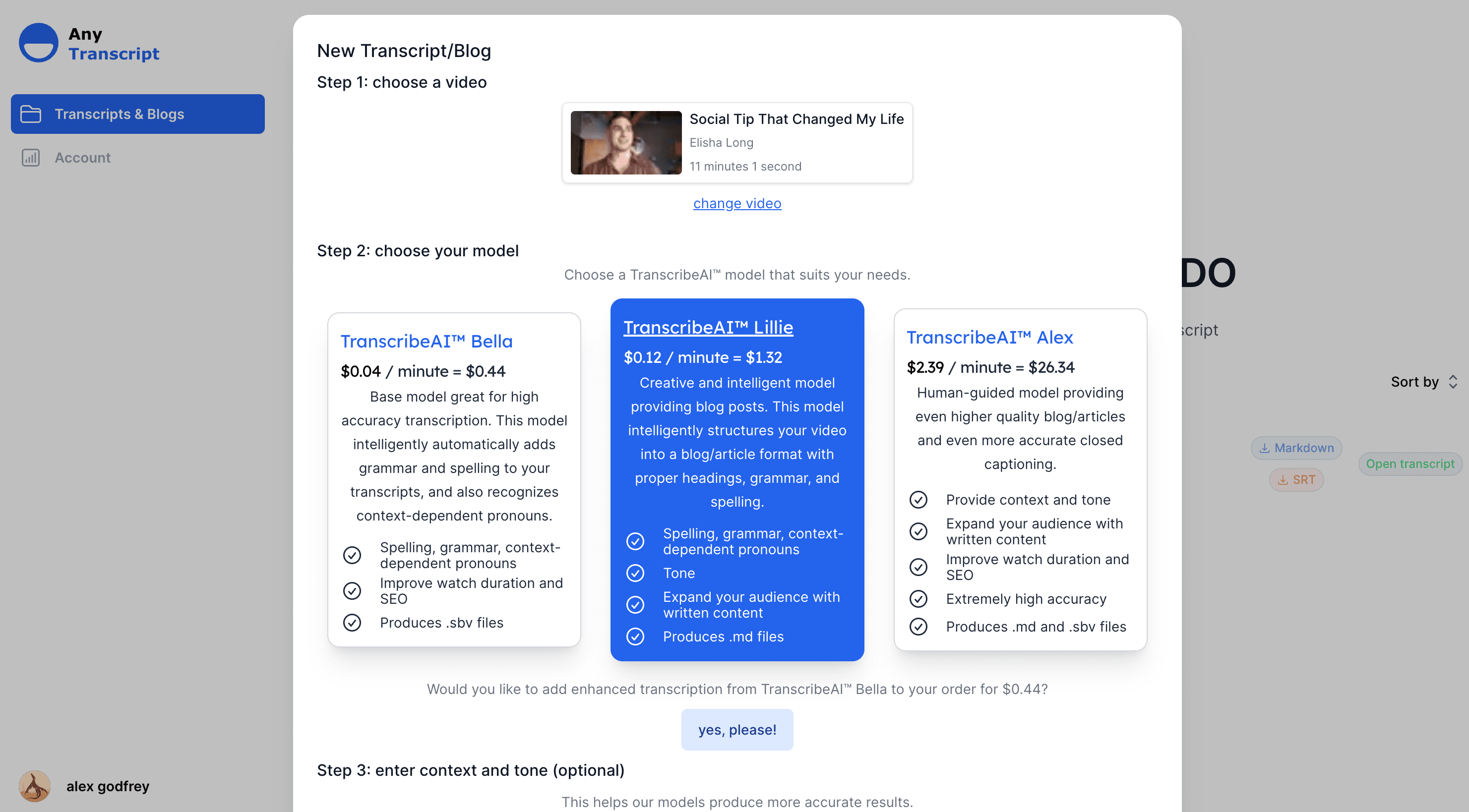TranscribeAI™ is a large language model (LLM) trained on billions of words of text, including transcripts from millions of videos. Depending on the model you select, you can optionally enter video context and video tone to further improve the quality of your transcript.
